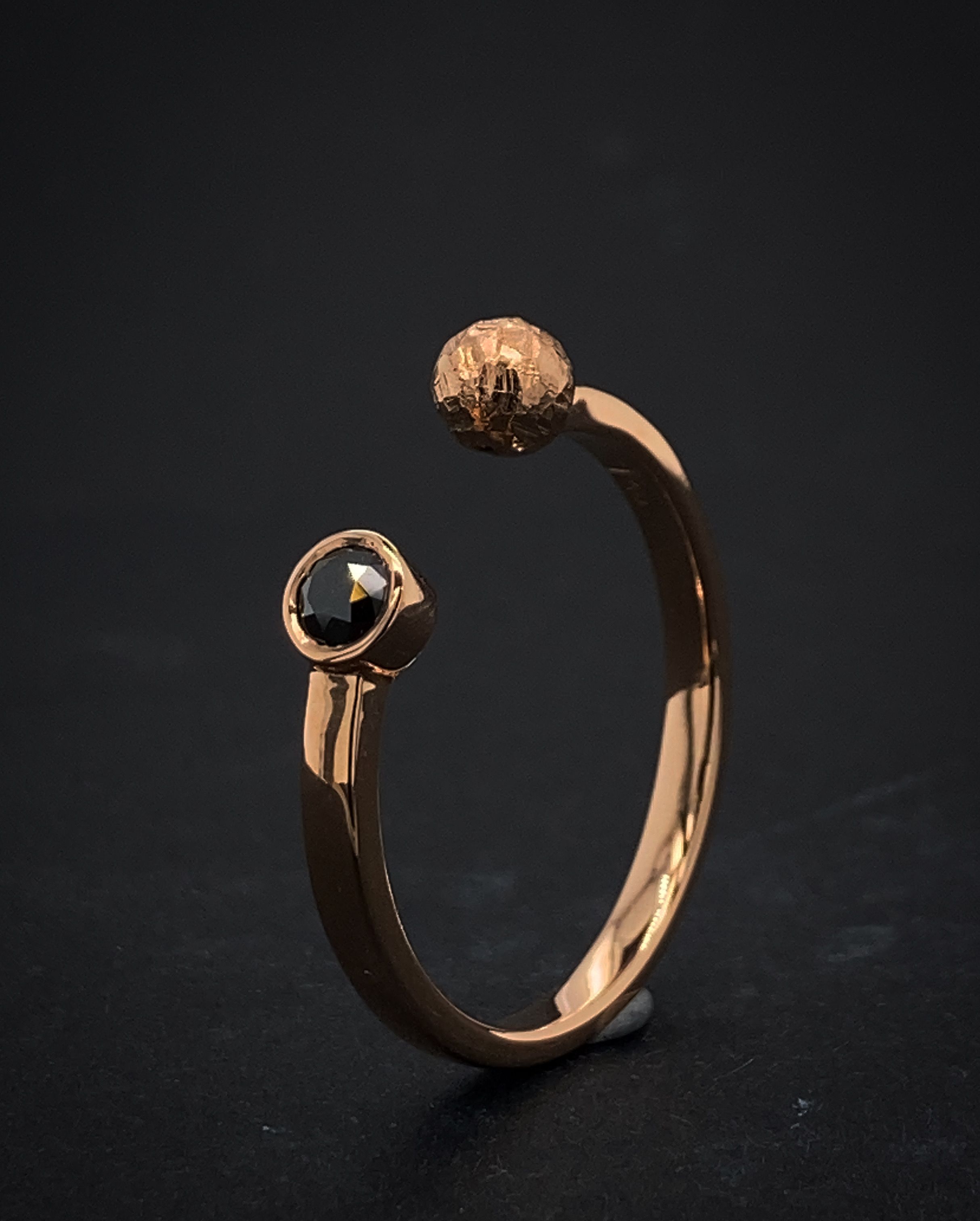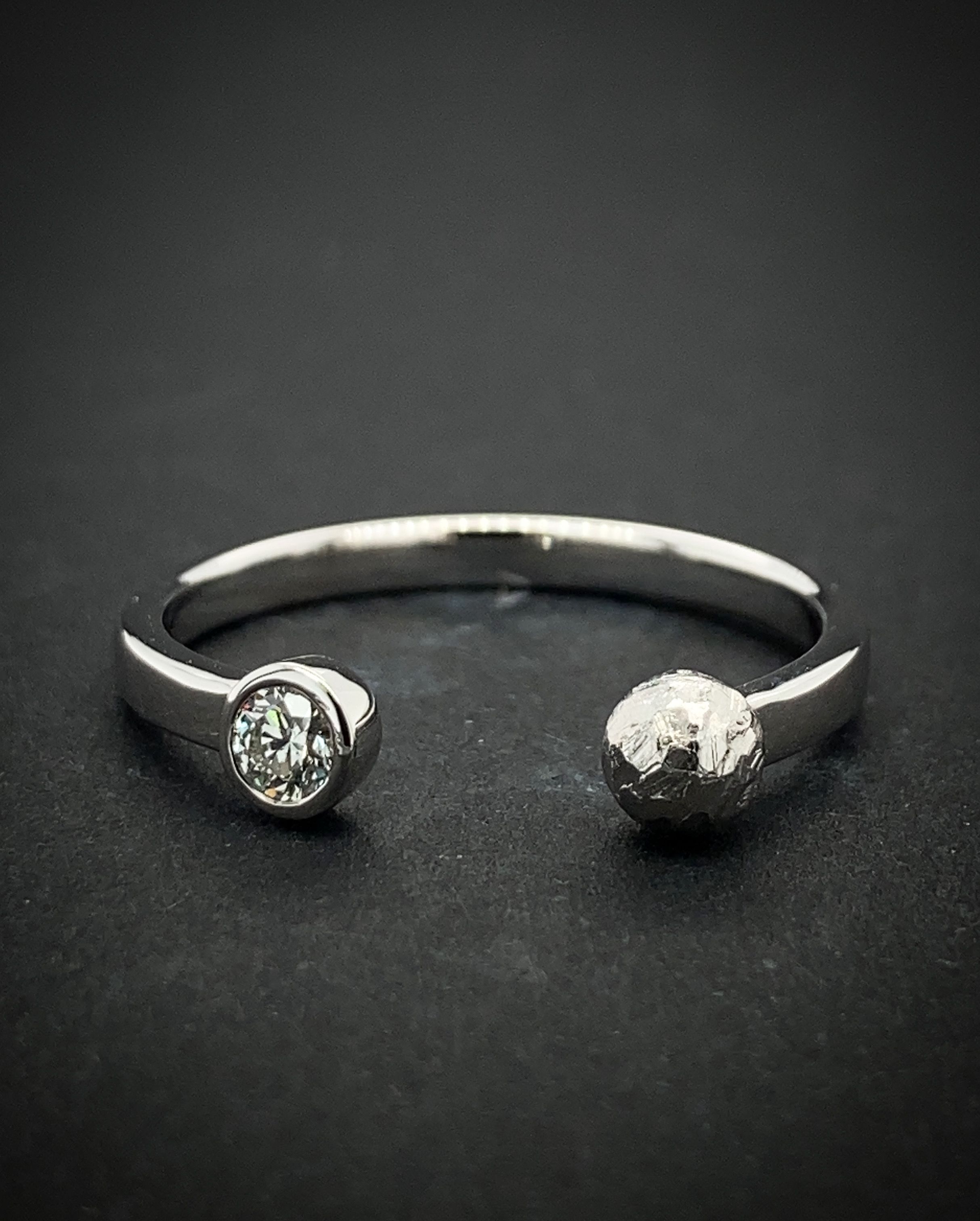 Rozevřený prsten ozdobený kamenem o velikosti 3mm a kuličkou v rustikální úpravě. Skvěle se dá zkombinovat s jinými prsteny např. s prstenem Rustik nebo jen tak samostatně na prstě. Rustikální povrch lze na přání udělat i po celé obroučce.