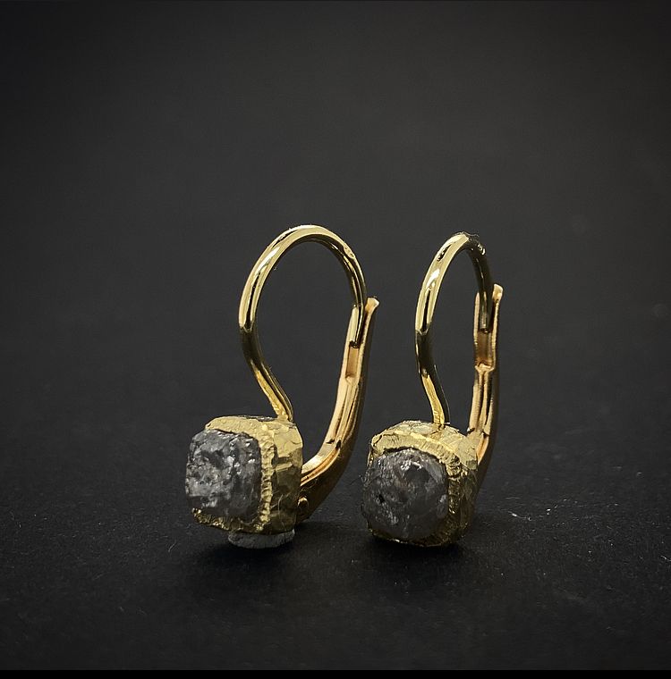 Velmi elegantní ručně vyráběné náušnice s Raw/surovýmidiamanty Cube o velikosti diamantu cca 4x4mm, každý diamant je vždy tvarem a barvou originální. Lze tak použít barevně černé nebo šedé diamanty. Zapínání lze i upravit tak, že lze dodělat "zámečky" které zabrání ztrátě náušnic při každodenním nošení. Náušnice jsou vyráběny ze zlata o ryzosti 14karátů (585/000).