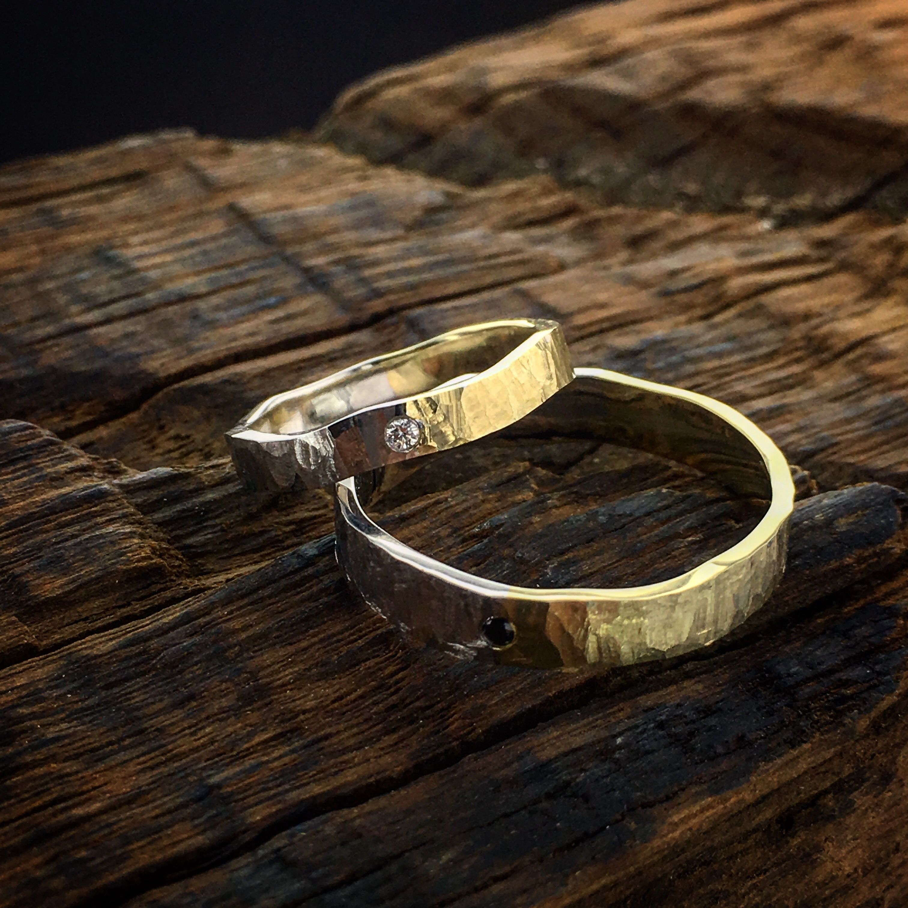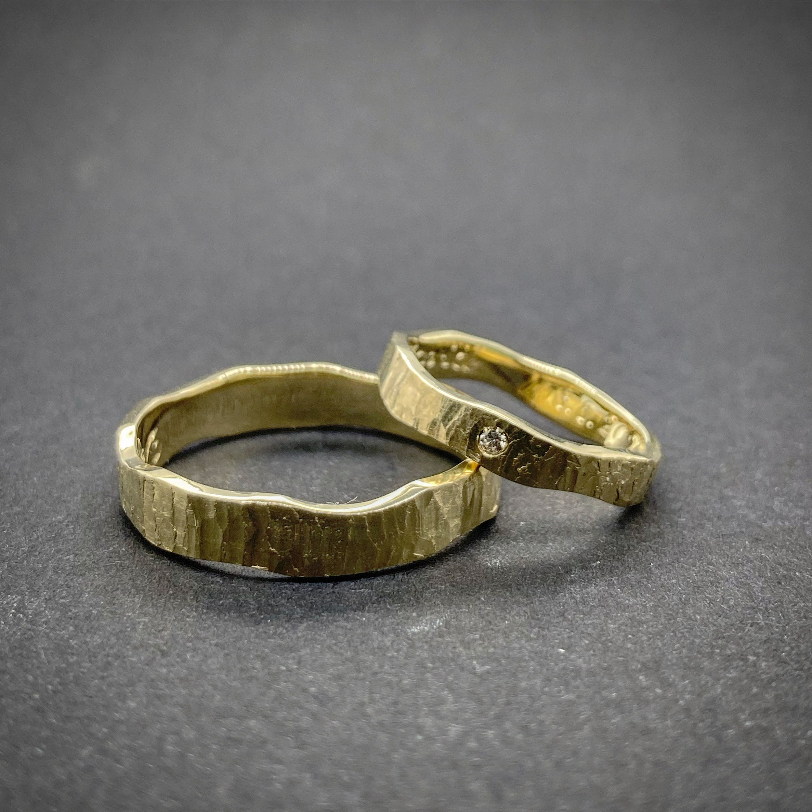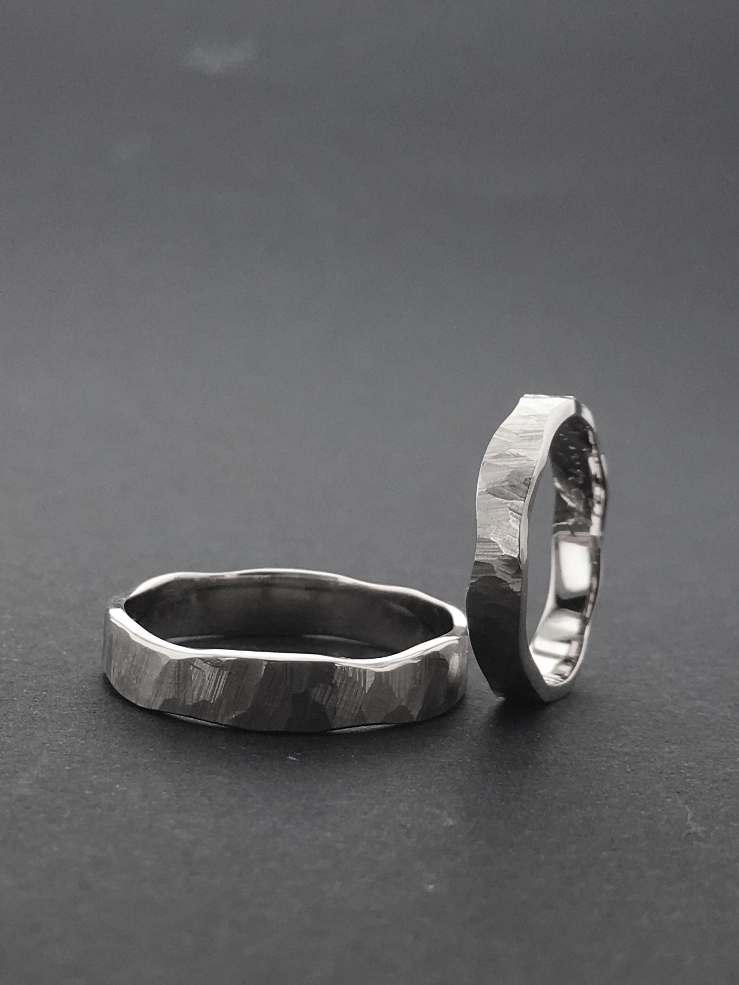 Snubní prsteny s nepravidelnou boční stranou a rustikální povrchovou úpravou. Pánský v šířce 4,50mm dámský 3,50mm. Šířku prstenů lze zvolit níže v konfigurátoru. Do dámského prstenu lze vsadit i kámen o velikosti 1,60mm.