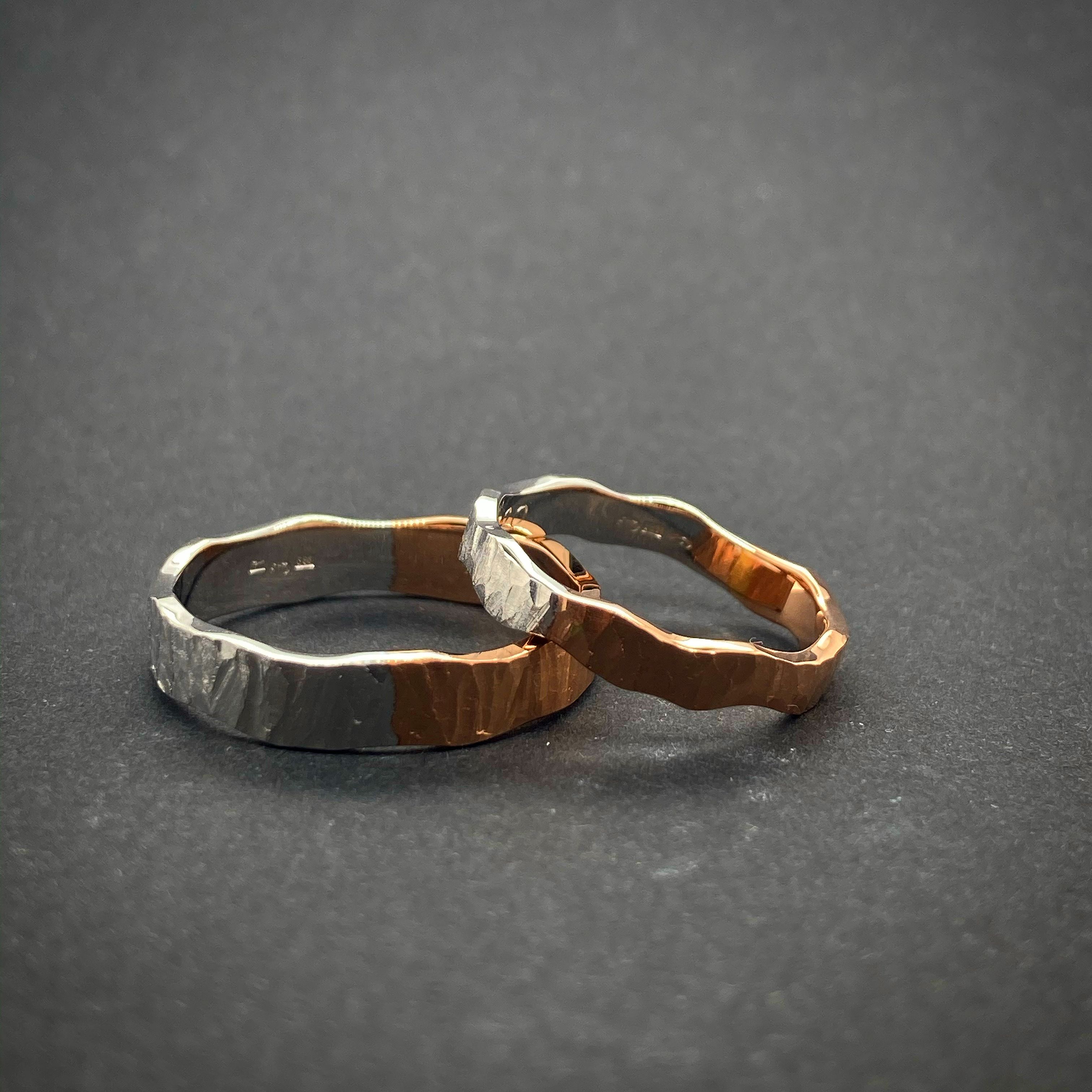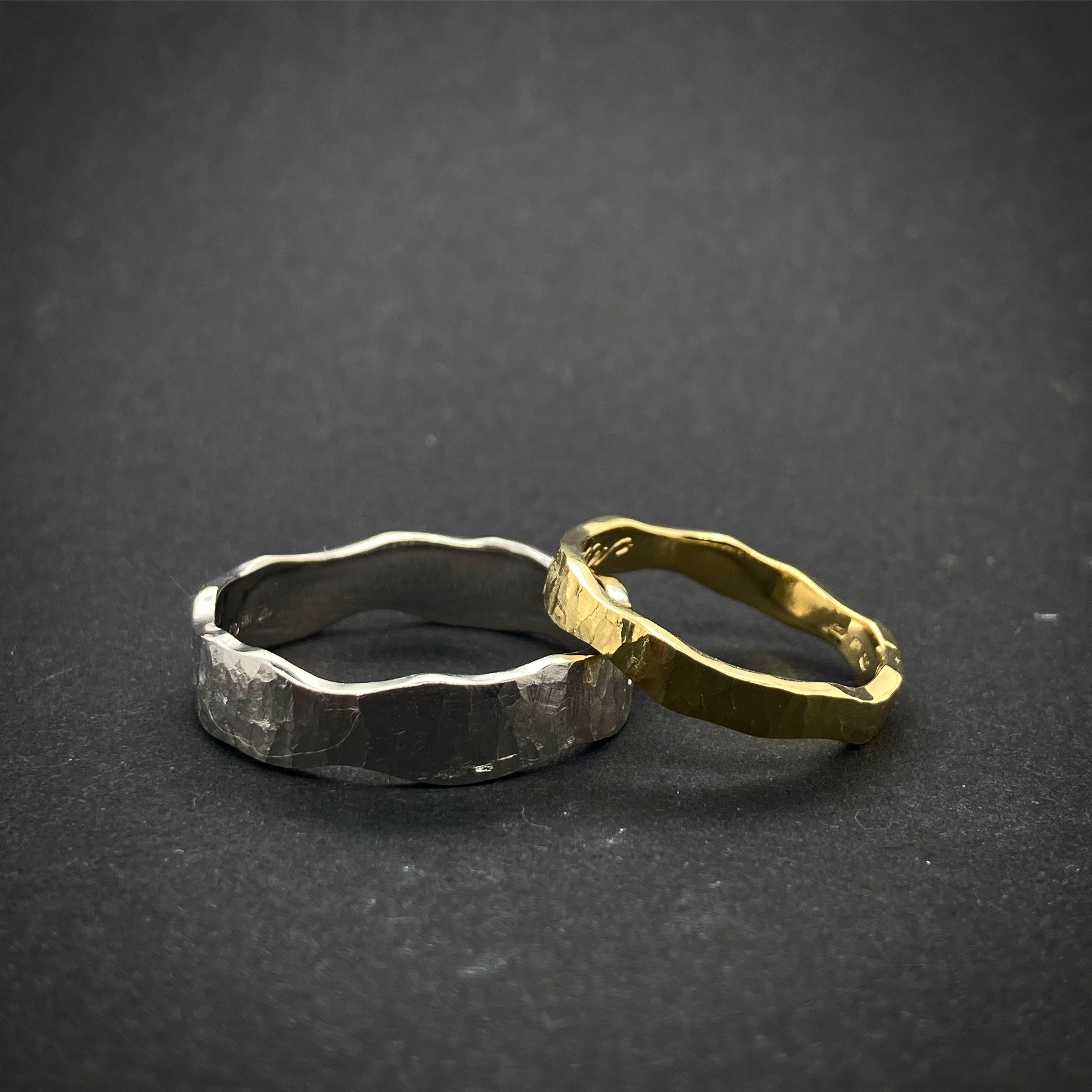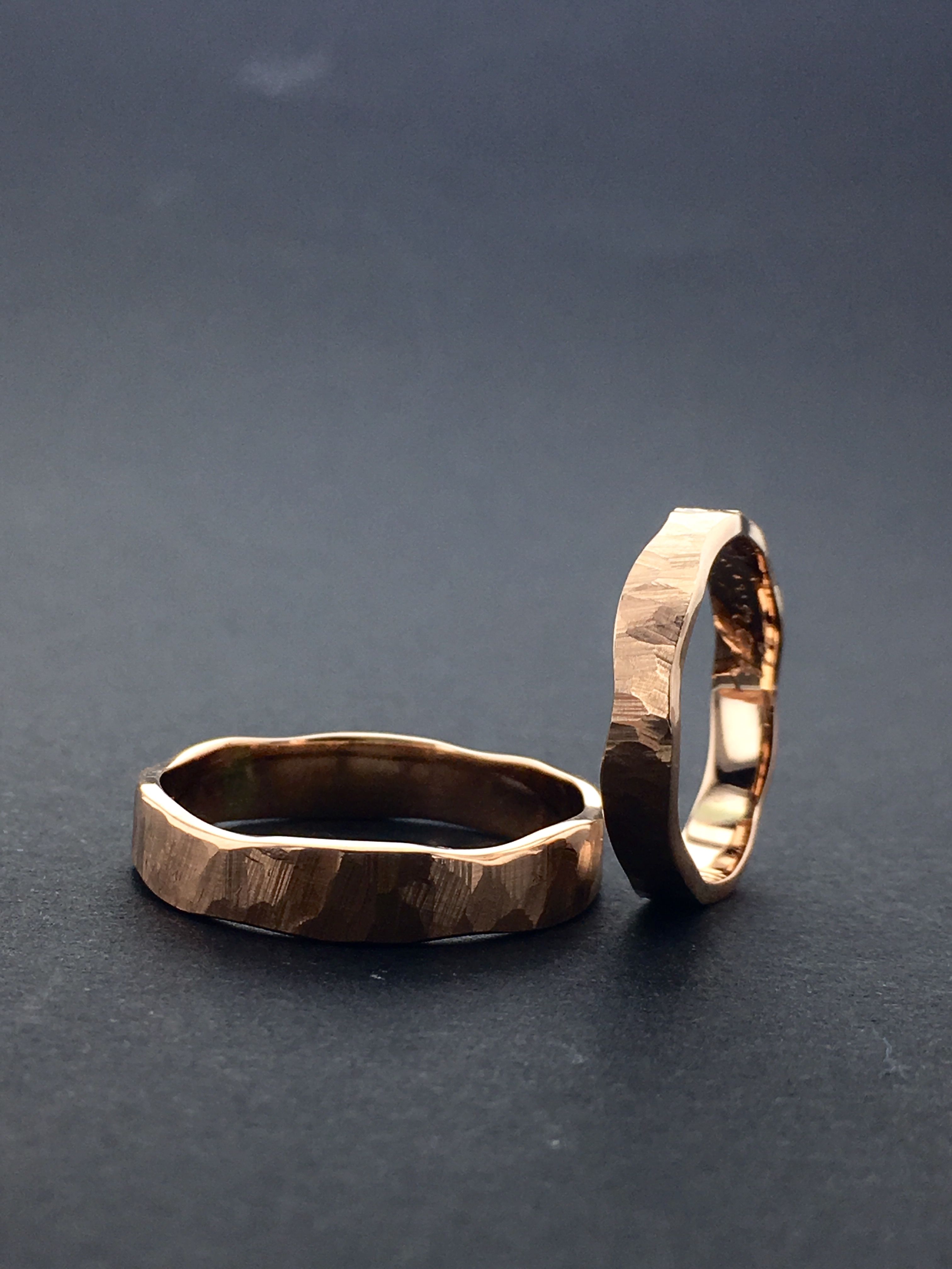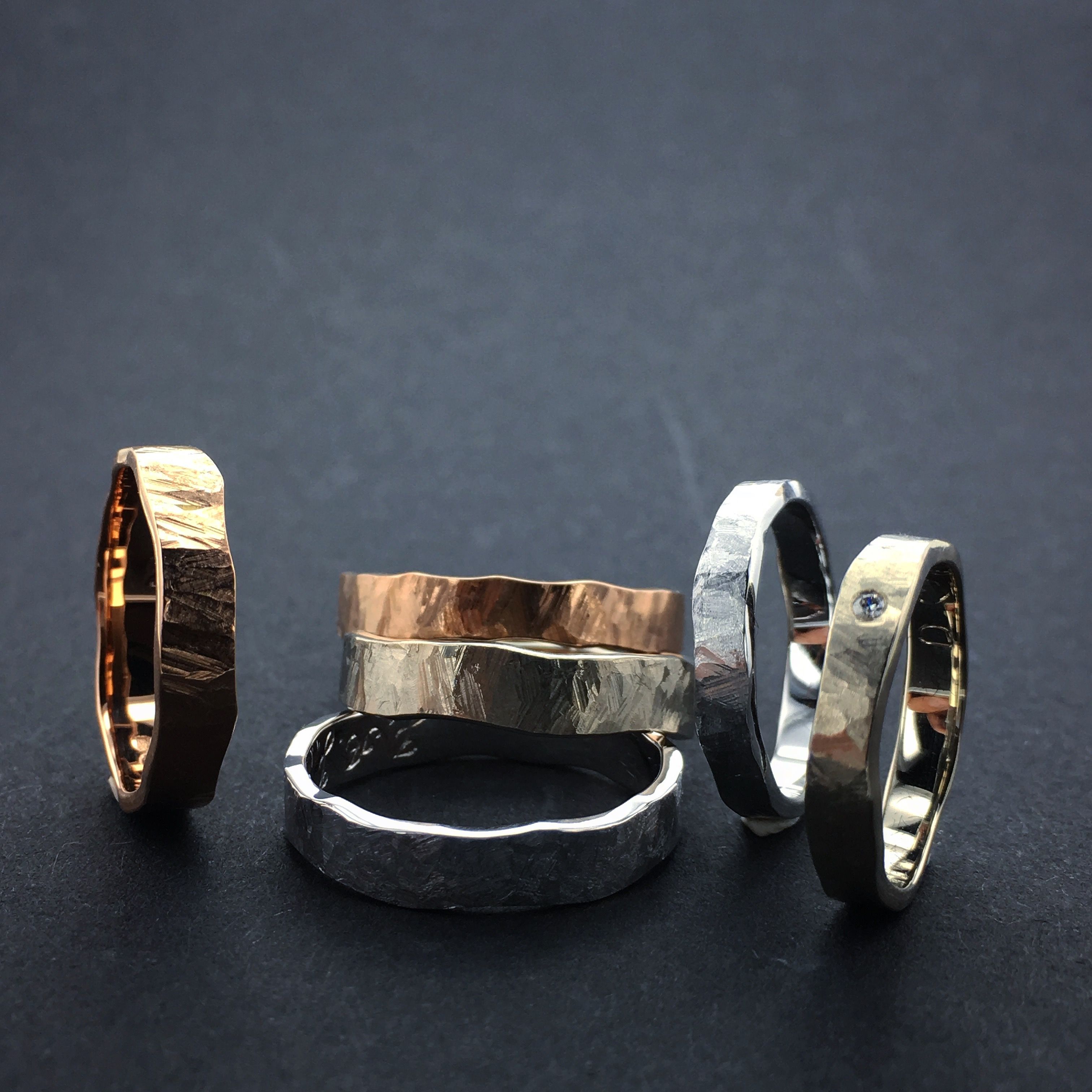 Snubní prsteny s nepravidelnou boční stranou a rustikální povrchovou úpravou. Pánský v šířce 4,50mm dámský 3,50mm. Šířku prstenů lze zvolit níže v konfigurátoru. Do dámského prstenu lze vsadit i kámen o velikosti 1,60mm.