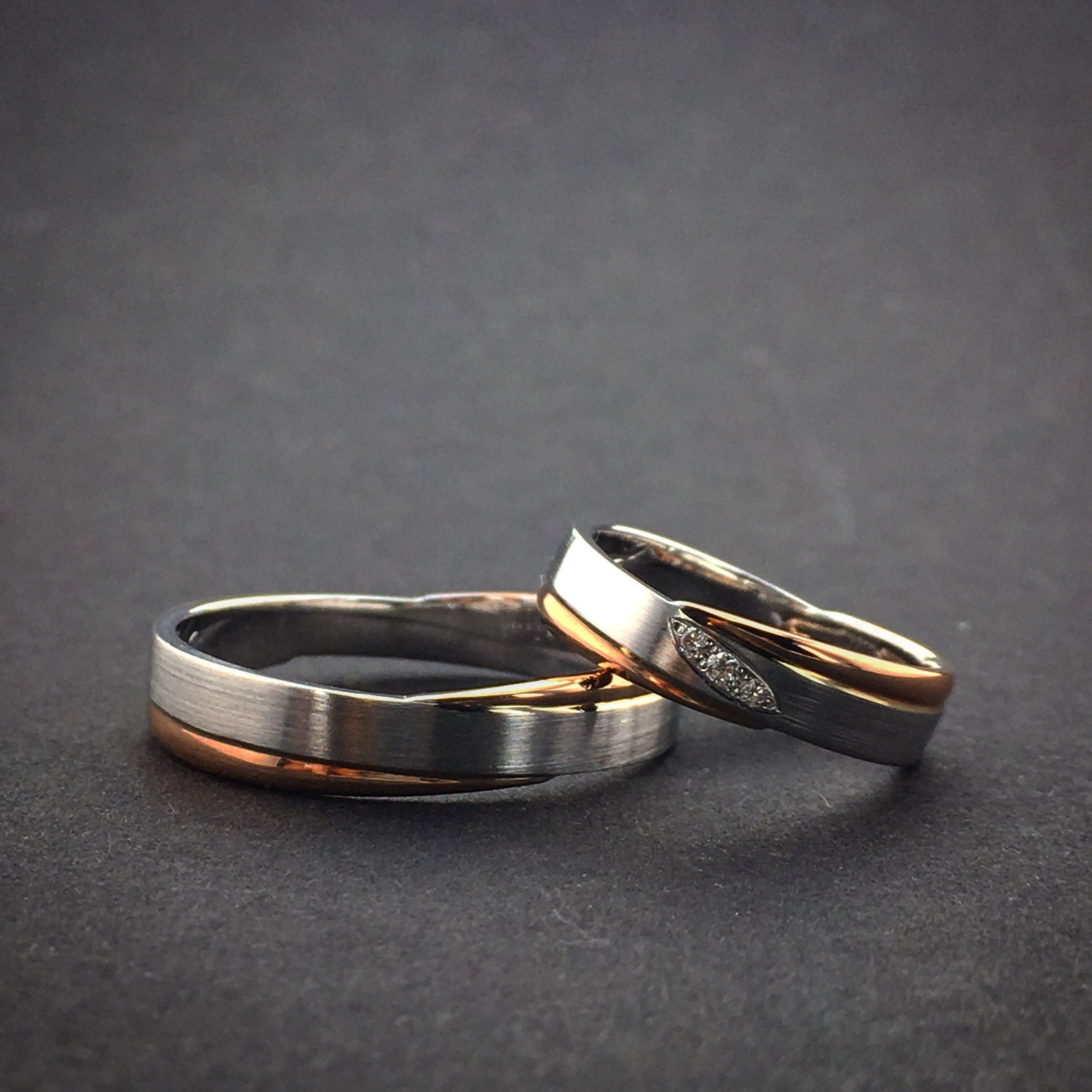 Snubní prsteny v kombinaci bílé a růžové zlato s matnou povrchovou úpravou na přání lze udělat i v lesklém provedení. V dámském prstenu jsou vsazeny 3 kameny o velikosti 2ks 1,20mm a 1ks 1,50mm. Dámský prsten lze udělat i bez kamenů. Šířka obou prstenů je v nejšírším místě 3,50mm. Šířku prtenů lze zvolit individuálně níže v konfigurátoru. Prsteny lze i barevně kombinovat požadovanou kombinaci barev zlata můžete uvést do speciálního požadavku.