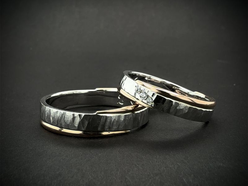 Ručně vyrobené snubní prsteny v kombinaci barev zlata, které si můžete zvolit dle vašich představ. Originální rustikální povrch dodává prstenům jedinečnost a nadčasovost i díky jejim netradičním liniím, kterou je rovná středová část a navazující boční části, které jsou lehce kónocké a elegantně zaoblené v lesku.