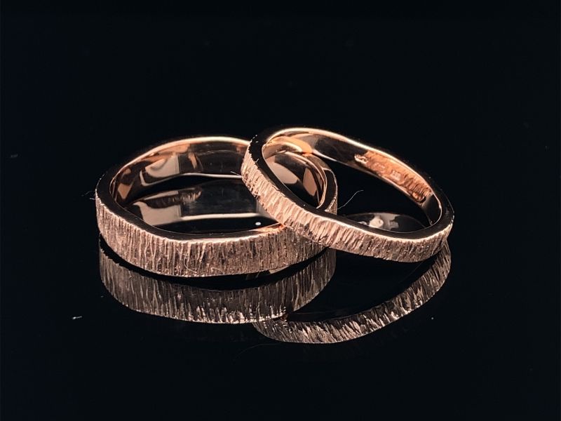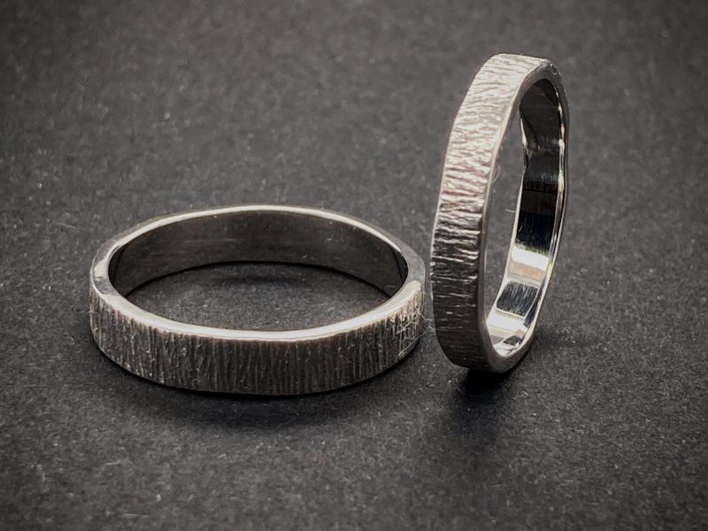 Snubní prsteny s lehce nepravidelnou boční stranou a strukturou imitující kůru stromu. Dámský prsten je v šířce 3,50mm s lze do něj vsadit kámen o průměru 1,50mm. Pánský je v šířce 4,50mm. Šířky obou prstenů lze změnit dle vašeho přání.