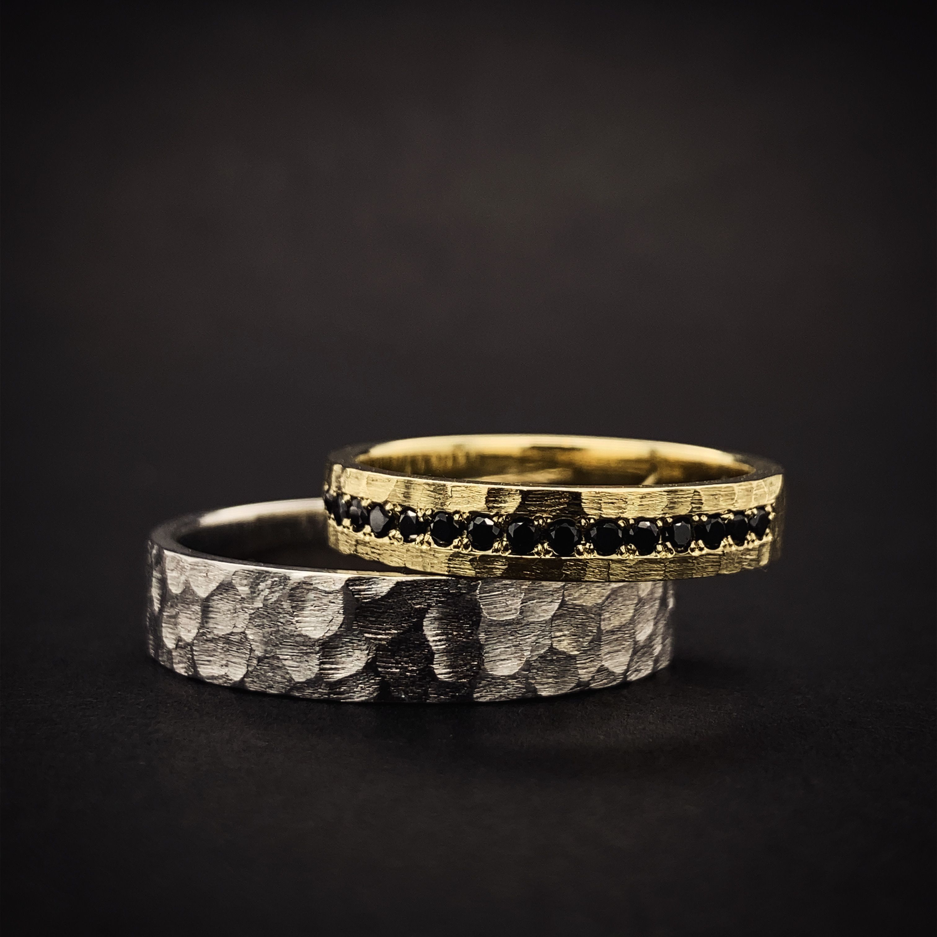 Snubní prsteny s ručně frézovanou povrchovou úpravou . Dámský prsten o šířce 3,50mm zdobí 3 kameny o velikosti 1,40mm, kdy jejich počet i barvu lze individuálně upravit. Pánský prsten je v šířce 5 mm . Šířky obou prstenů lze upravit dle vašeho přání.