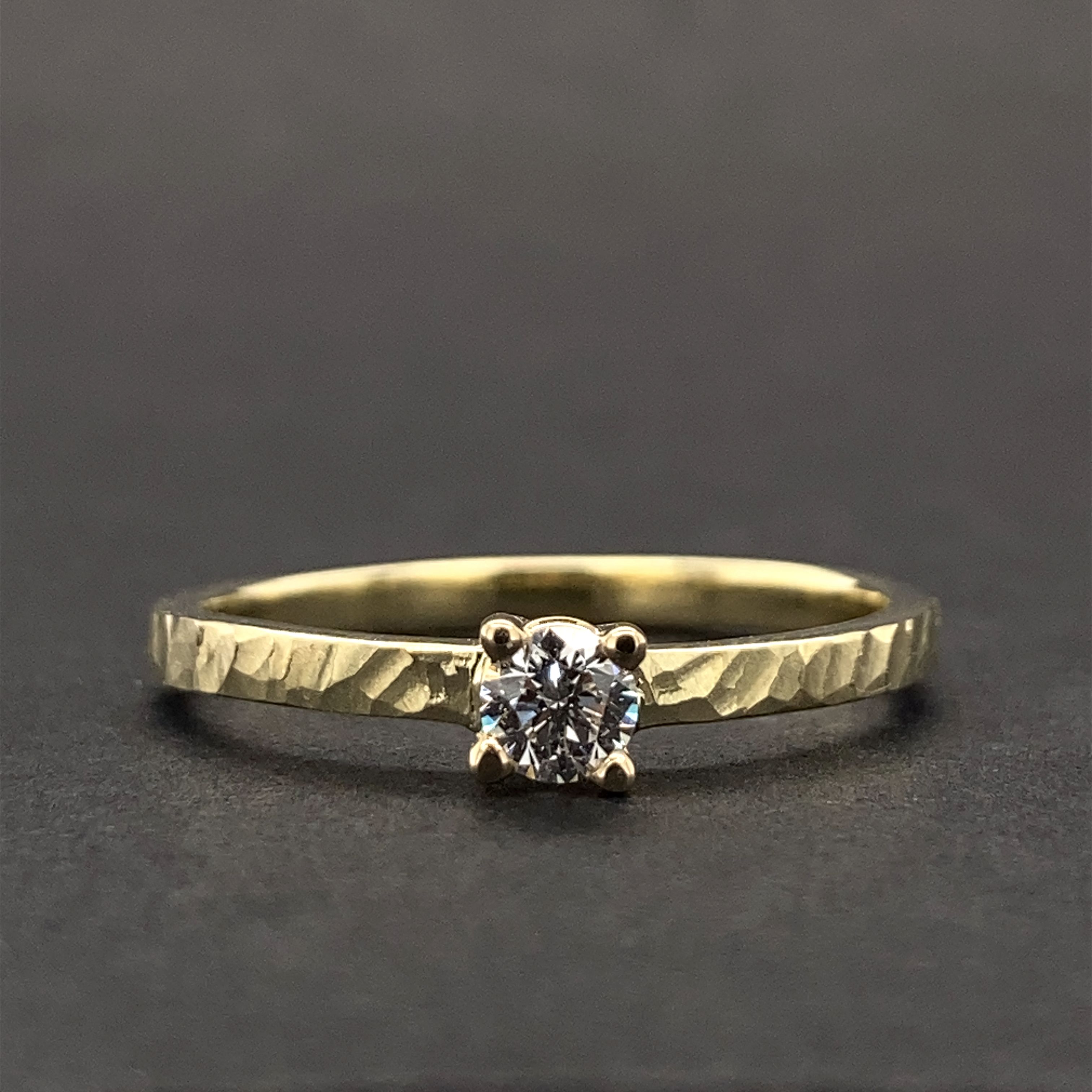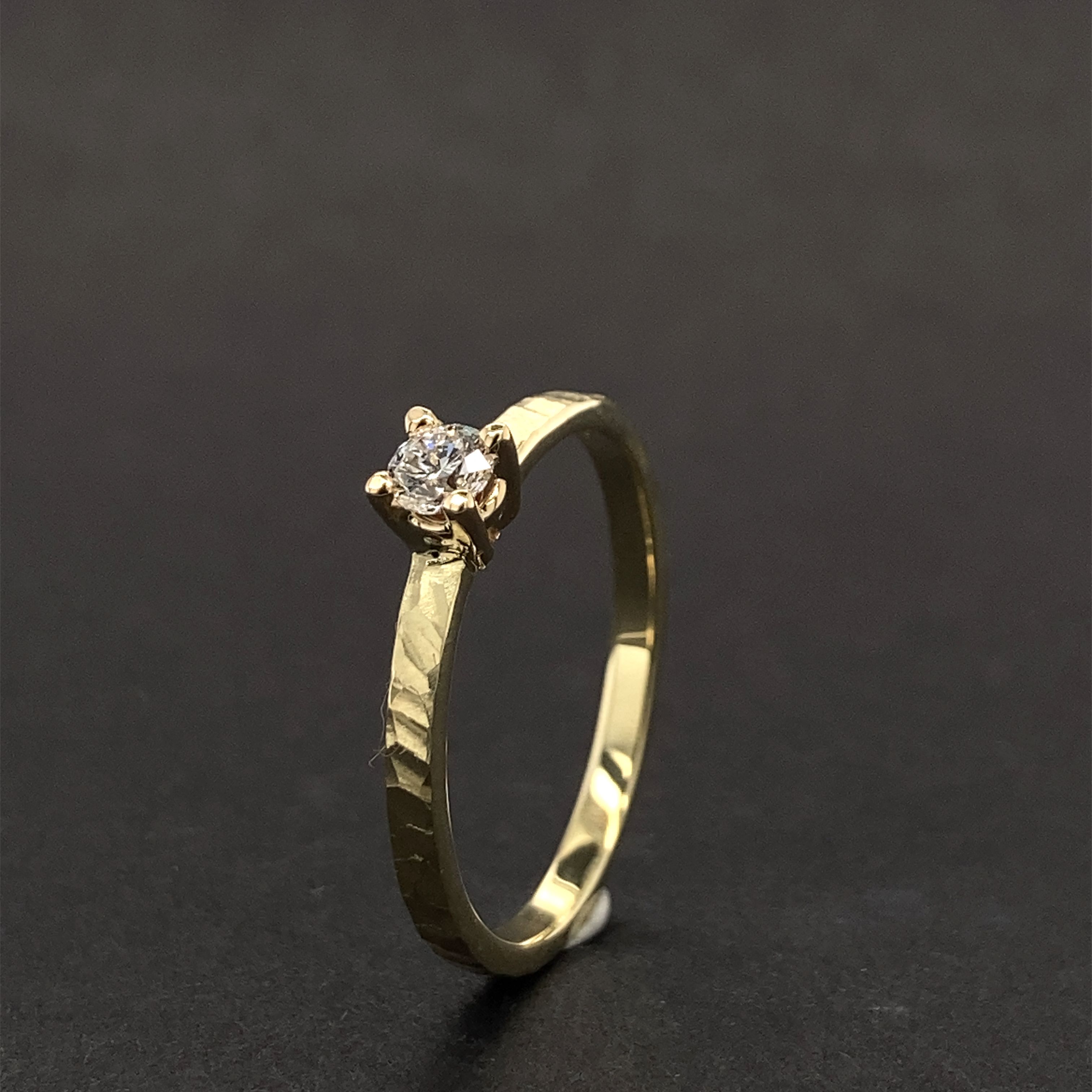 Ručně vyrobený a velmi oblíbený prsten Rustik ze žlutého zlata 585/000 (14karátů) s netradiční rustikální povrchovou úpravou a lehce nepravidelnou obroučkou, který lze dokonale zkombinovat i se snubními prsteny 12/H . Prsten je ve velikosti 54 a lze ho na vaše přání velikostně upravit.