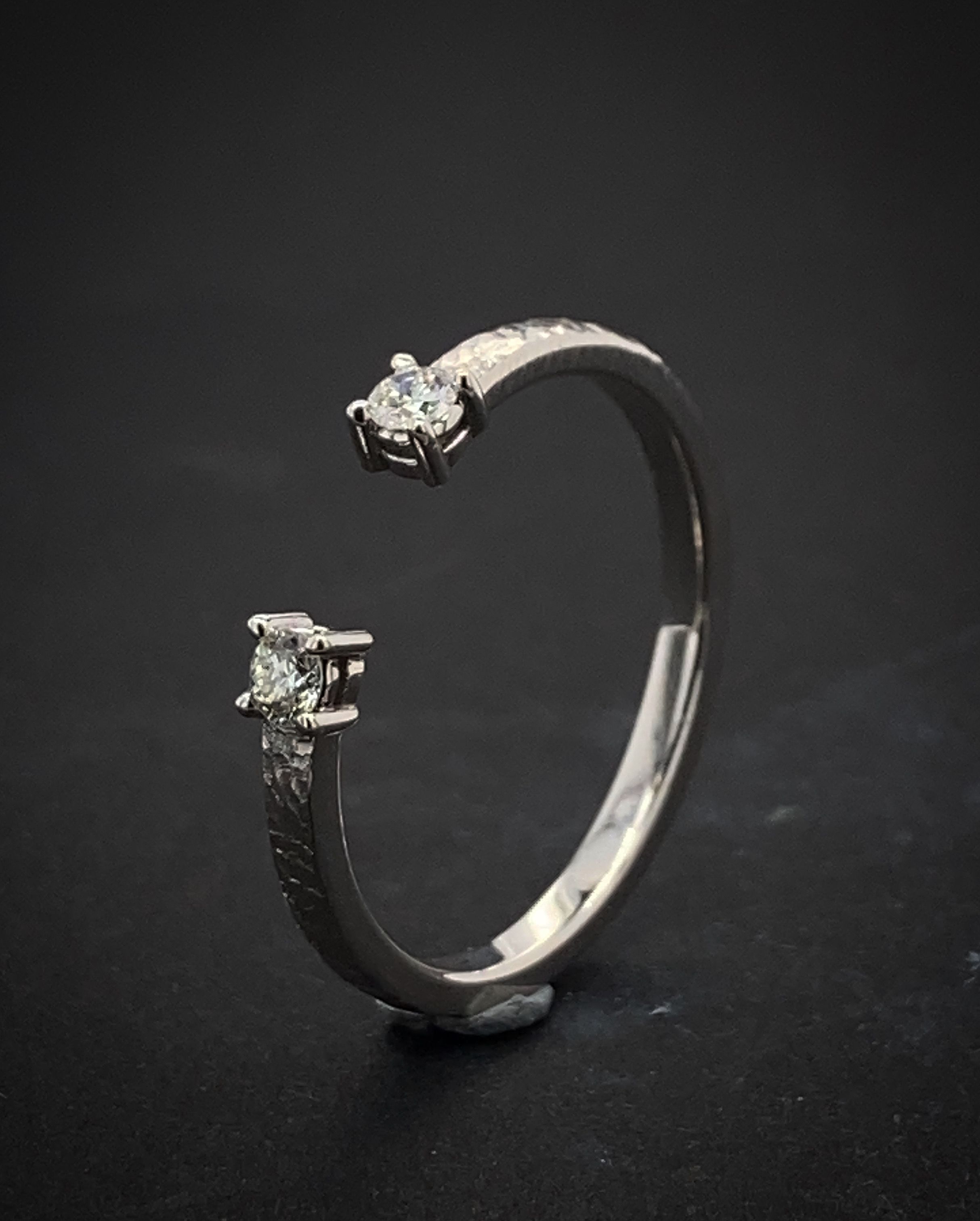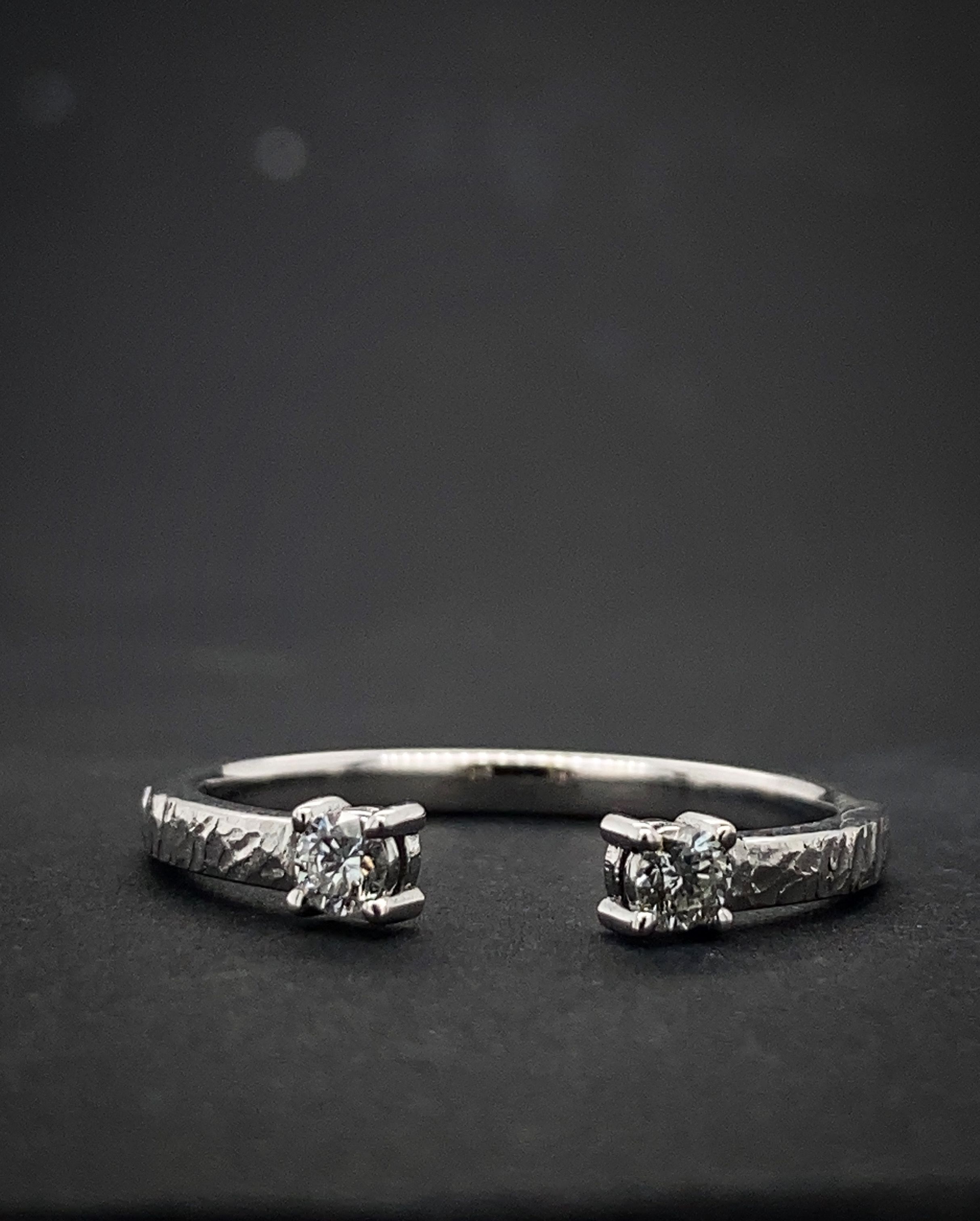 Rozevřený prsten ozdobený přírodními diamanty v rustikální úpravě. Skvěle se dá zkombinovat s jinými prsteny např. s prstenem Rustik nebo jen tak samostatně na prstě.